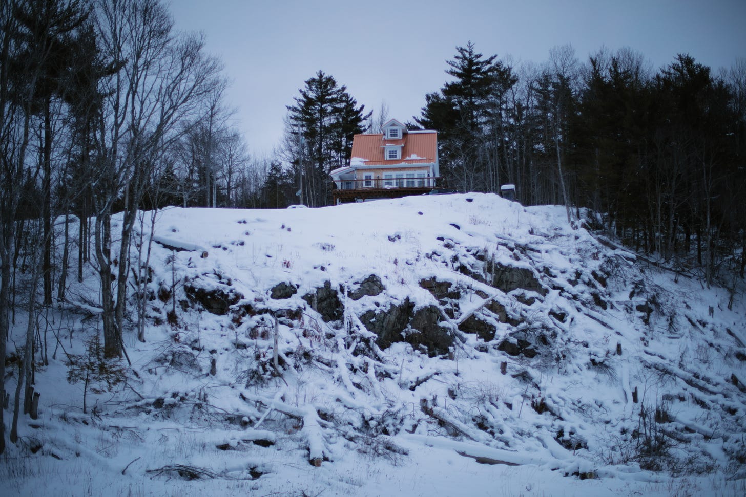 When I’m down in a hollow and a home or cabin appears above, it’s always this strangely revelatory experience. Am I being watched? There could be eyes I’d never know, like some soldier hidden in his castle garret, as if I were a threat to watch for. What do I know about the thoughts of some stranger? Who watches the sleepy Nictaux River, roaring and rising, sinking and trickling, and the deer who feed in the floodplain meadow. It’s such a welcome sight to stay for the bluing evening — I’ve gotten weary of all the whites and greys these days. That orange metal roof brings a little something to the otherwise monochrome. The chill bites hard tonight, and the deep, dry snow is all the way weightless. Offering no resistance, each footfall sinking to solid ground. I’m just trying my best to get a grip on gravity.