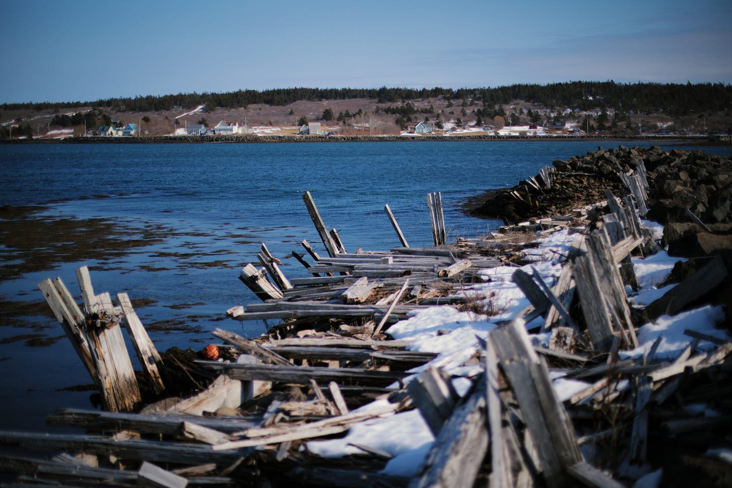 Anywhere free from snow has been quietly calling. Howling winds on lonesome Long Island help salt spray shake down winter, blown across in restless mist from Tiverton to Freeport. It’s the one sure place with patches of bare earth showing. The harsh sun shouldn’t be mistaken for offering warmth. Well, maybe from the driver’s seat where wind can’t reach me. There’s plenty of life in tiny homes on the coast, but as always, I turn to what’s dying. This wharf is slowly rotting its way to being nothing but a breakwater, rocky companions already present for some pre-stacked future cairn. There’s nowhere I’ve felt more foreign when I’m not really so far from home. It’s the longest dead-end drive in the province that does it, following Digby Neck till the highway sinks to the sea at East Ferry. Being on an island makes you think of time differently. Sometimes slower, when there’s less to do or places to go. Sometimes faster, as the rushing clock warns you that you ferry back is leaving. If my life was not so subject to wandering, island life might suit me well.